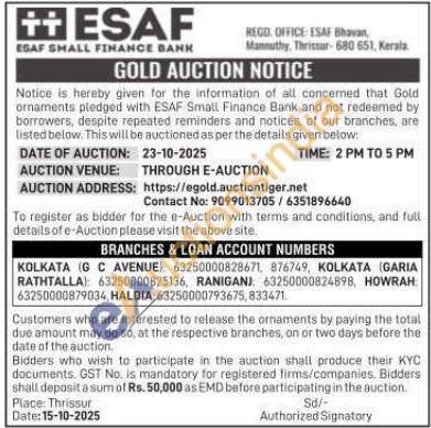 ESAF SMALL FINANCE BANK Gold Auctions Auction in Kolkata