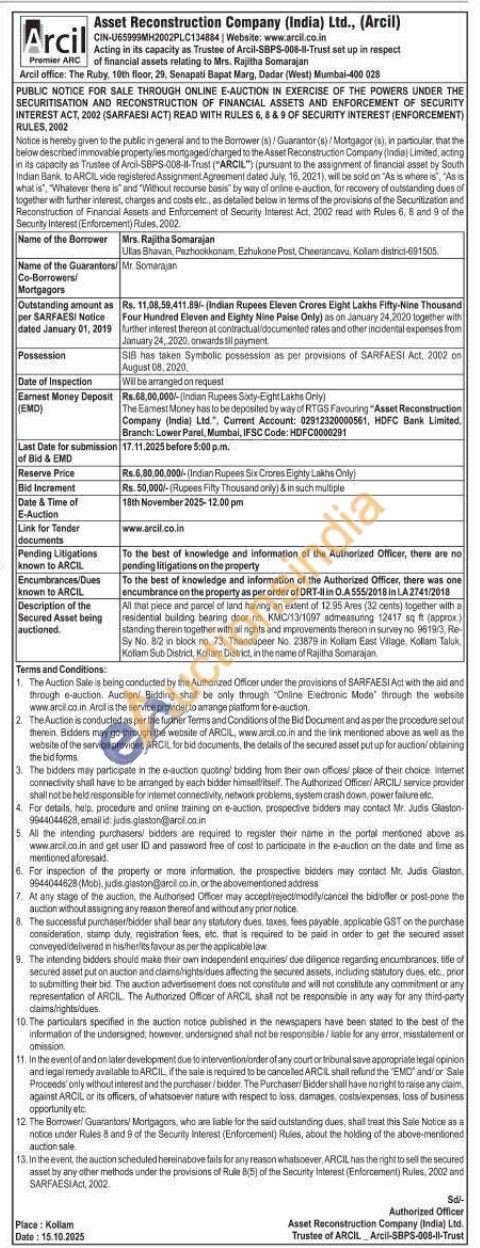 All that piece and parcel of land having an extent of 12.95 Ares (32 cents) together with a residential building bearing door no. KMC/13/1097 admeasuring 12417 sq ft (approx) standing therein together with all nights and improvements thereon in survey по 9619/3, Re Sy No. 8/2 in block no. 73, Thandapeer No. 23879 in Kollam East Village, Kollam Taluk Kollam Sub District, Kollam District, in the name of Rajitha Somarajan
