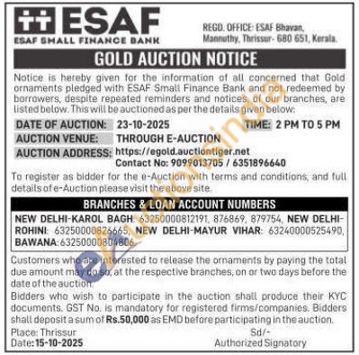 ESAF SMALL FINANCE BANK Gold Auctions Auction in New Delhi