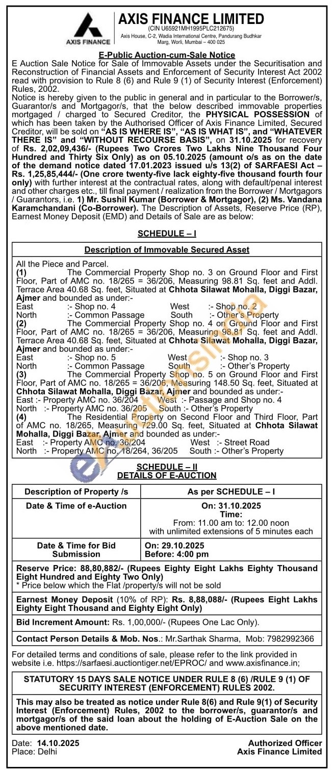 (3) The Commercial Property Shop no. 5 on Ground Floor and First Floor, Part of AMC no. 18/26536/206, Measuring 148.50 Sq. feet, Situated at Chhota Silawat Mohalla, Diggi Bazar, Ajmer and bounded as under:- East:- Property AMC no. 36/204 West Passage and Shop no. 4 North Property AMC no. 36/205 South: Other's Property