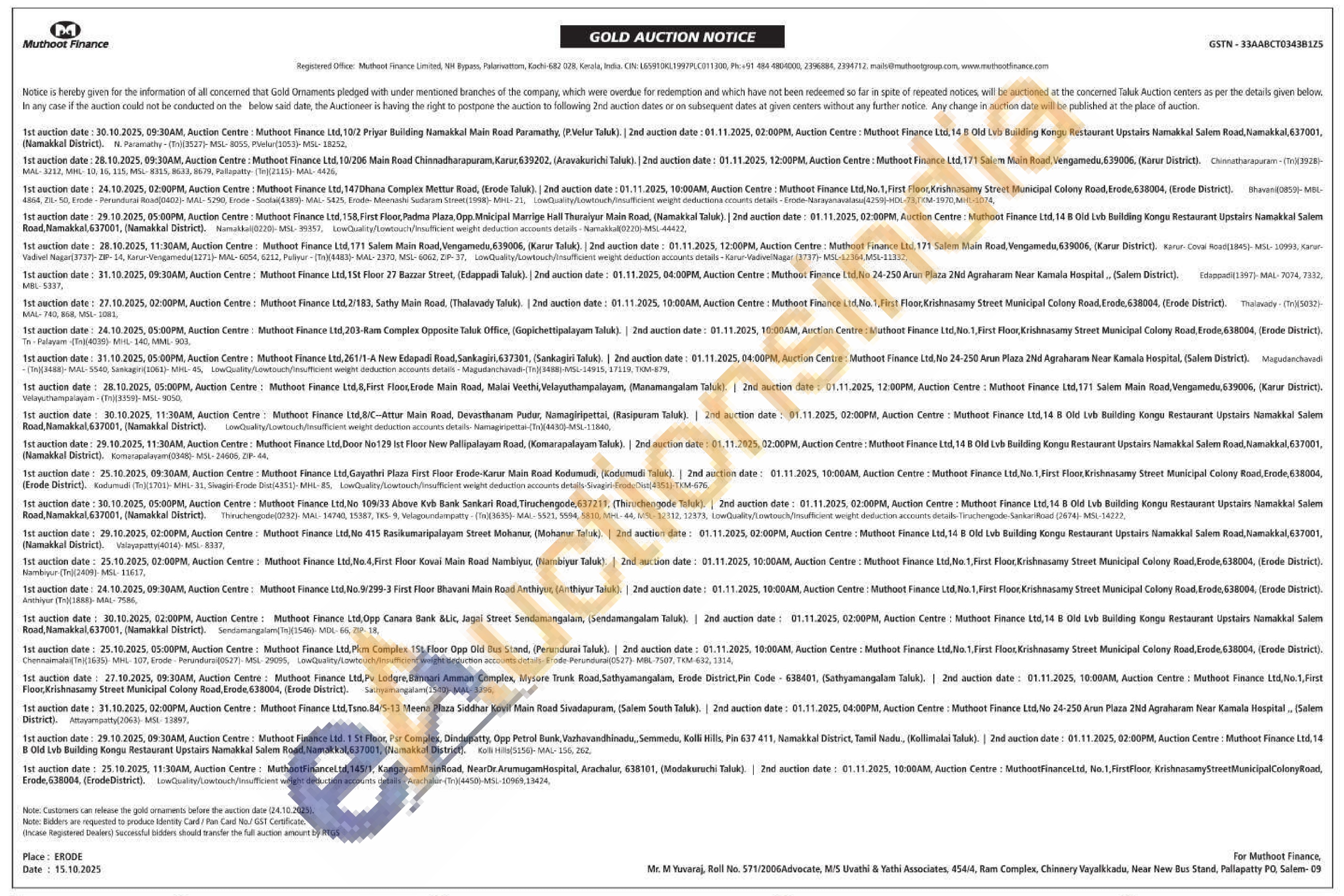 Muthoot Finance Ltd Gold Auctions Auction in Erode
