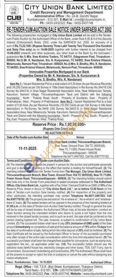 Item No.1: Vacant Residential Plot to a total extent of 5.30 Ares (As per Revenue Records) and (16.250 Cents as per Old Survey in Tittle Deed description) in Re-Survey No. 344/18 (Old Survey No 244/2-6) in Sree Nagar Residential Association Area, Near Melamcodu Temple, Karumom, Nemom Village. Thiruvananthapuram Taluk and District with the following boundaries North Thaikidy Road, South Property of Sundaran, East Property of Prabhakaran, West: Property of Prabhakaran. Item No.2: Vacant Residential Plot to a total extent of 5.50 Ares (As per Revenue Records) (16.250 Cents as per Old Survey in title deed description) in Re-Survey No.344/B (Old Survey No.244/2-3) in Sree Nagar Residential Association Area, Near Melamcodu Temple, Karumom, Nemom Village, Thiruvananthapuram Taluk and District with the following boundaries: North Property of Raj, South Property of Raj, East: Property of Manian, West: Thakidy Road.