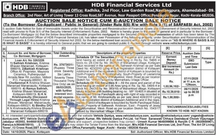 Securities 1: All the piece and parcel of the land having an extent of 8.43 Ares lying in Re.Sy. No. 548/5 in block no. 24 (Old Sy. No. 383/10) of Manarkkad village, Kottayam Taluk recorded in the name of Mr. Satheesh Krishnan as per Sale Deed No. 423/2010 Lying in Sub registration district of Kottayam Additional and in the registration District of Kottayam is bounded by North-Property of KR Krishnakutty, South-Property of Leelamma Thomas, East-Property of Maliyekkal, West-Road as per location Sketch No. 1541/17issued by Mannarkadu Village Officer
