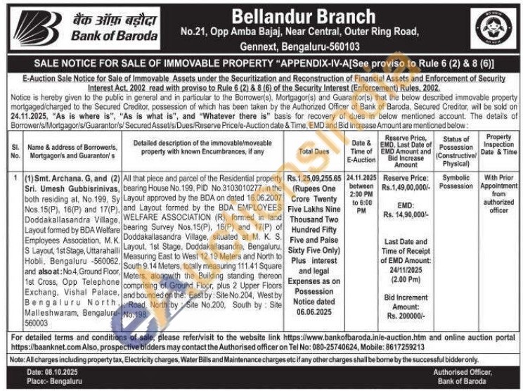 All that piece and parcel of the Residential property bearing House No. 199, PID No.3103010277, in the Layout approved by the BDA on dated 16.06.2007 and Layout formed by the BDA EMPLOYEES WELFARE ASSOCIATION (R), formed in land bearing Survey Nos. 15(P), 16(P) and 17(P) of Doddakallasandra Village, situated at M. K. S. Layout. 1st Stage, Doddakallasandra, Bengaluru, Measuring East to West 12.19 Meters and North to South 9.14 Meters, totally measuring 111.41 Square Meters, alongwith the Building standing thereon comprising of Ground Floor, plus 2 Upper Floors and bounded on the: East by Site No.204, Westby Road, North by Site No.200, South by: Site No. 198