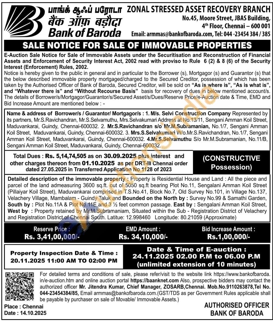Detailed description of the immovable property: Property is Residential House and Land: All the piece and parcel of the land admeasuring 3600 sq.ft. out of 5050 sq.ft bearing Plot No.11, Sengalani Amman Koil Street (Pillaiyar Koil Street), Maduvankarai comprised in T.S.No.41, Block No.7, Old Survey No.101, in Village No. 137, Velachery Village, Mambalam - Guindy Taluk and Bounded on the North by: Survey No.99 & Samathi Garden, South by: Plot No.11A & Plot No. 11E and 31½ feet common passage. East by: Sengalani Amman Koil Street, West by: Property retained by Mr.M.Subramaniam, Situated within the Sub - Registration District of Velachery and Registration District of Chennai South. Latitue: 12.998460 Longitude: 80.21059 (Approximate)