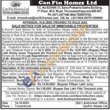 Description of the immovable property: An extent of 2.02 ares of land along with a residential house constructed thereon at Re Sy 305/10-2 of Parassala Village, Nevyattinkara Taluk, within jurisdiction of Parassala Sub Registrar office, Thiruvananthapuram District Boundaries; North by: Pathway, East by: Property of Sathyara; West by: Property of Meenakshi, South by: Property of Ravi