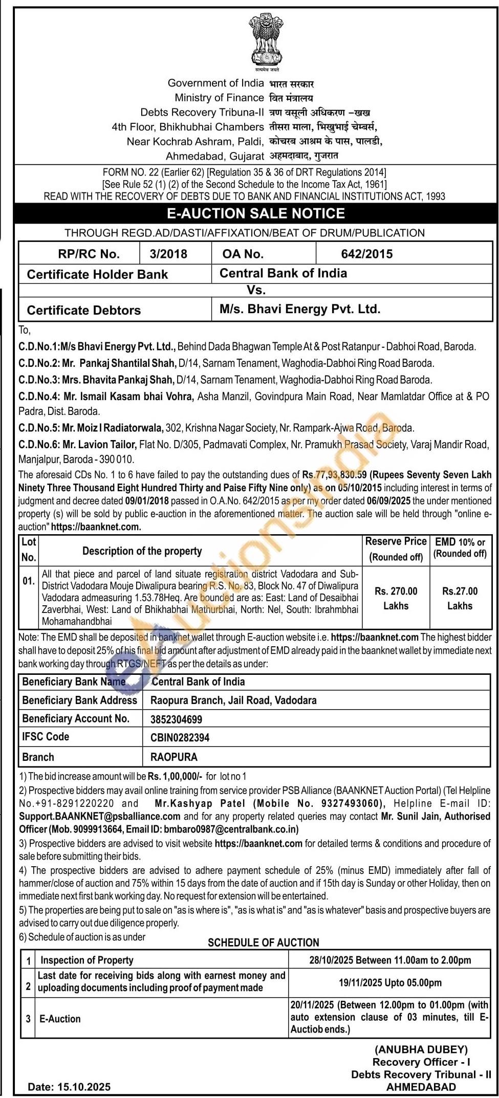 All that piece and parcel of land situate registration district Vadodara and Sub-District Vadodara Mouje Diwalipura bearing R.S. No. 83, Block No. 47 of Diwalipura Vadodara admeasuring 1.53.78Heq. Are bounded are as: East: Land of Desaibhai Zaverbhai, West: Land of Bhikhabhai Mathurbhai, North: Nel, South: Ibrahmbhai Mohamahandbhai