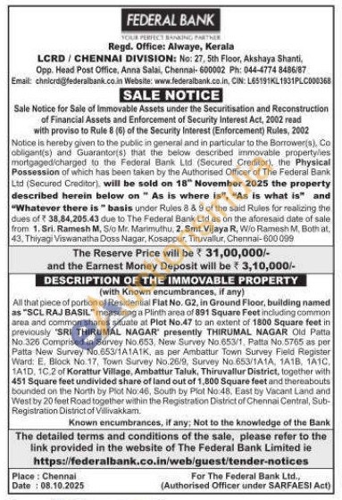 All that piece of portion of Residential Flat No. G2, in Ground Floor, building named as "SCL RAJ BASIL" measuring a Plinth area of 891 Square Feet including common area and common shares situate at Plot No.47 to an extent of 1800 Square feet in previously "SRI THIRUMAL NAGAR presently THIRUMAL NAGAR Old Patta No. 326 Comprised in Survey No. 653, New Survey No 653/1, Patta No.5765 as per Patta New Survey No.653/1A1A1K, as per Ambattur Town Survey Field Register Ward E. Block No.17, Town Survey No.26/9, Survey No 653/1A1A, 1A1B, 1A1C, 1A1D, 10.2 of Korattur Village, Ambattur Taluk, Thiruvallur District, together with 451 Square feet undivided share of land out of 1,800 Square feet and thereabouts bounded on the North by Plot No:46, South by Plot No:48. East by Vacant Land and West by 20 feet FRload together within the Registration District of Chennai Central, Sub-Registration District of Vilivakkam.