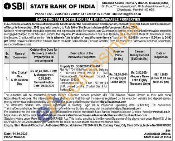 Property ID: SBIN200033594660 Flat No 1704 17th Floor, Wing B. Buliding 3. "sunteck West World I. Tivri Naigaon(east) Taluka-vasai District Palghar-401208 Carpet Area 393 Sq. Ft and The Flat is 1 BHK. owned by Mrs. Chaitali Das & Mr. Sukhen Das