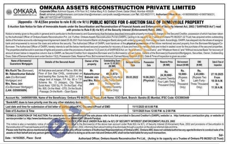 All that piece and parcel of Flat no. 804, 8th Floor of Sun Star CHSL, constructed on All that piece and parcel of Flat no. 804, 8th land bearing Rev. Survey No. 223/1, in the village limit of Adajan, F.P. No. 90 in T.P. Scheme No. 13 (Adajanj, City Taluka Surat Area: 1200 Sq. Ft. On the East -Flat No. 805, On the West: -OTS, On the South Passage. On the North-Open Space