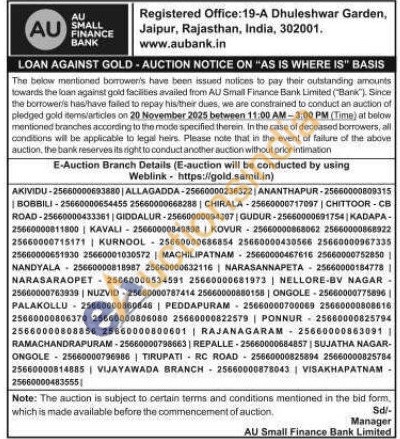 AU Small Finance Bank Gold Auctions Auction in West Godavari