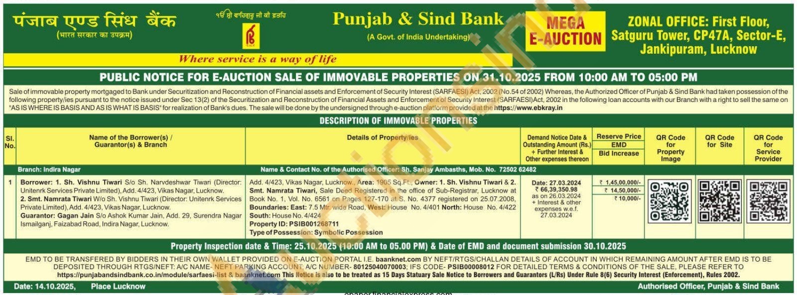 Contact No. of the Authorised Officer: Sh. Sanjay Ambasths, Mob. No. 72502 62482