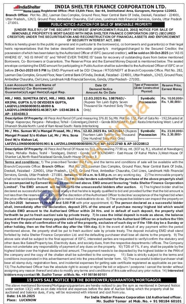 Description Of Property: All Piece And Parcel Of Land measuring 376.81 Sq.Mtr. Plot No. 152, Part of Gata No - 192, Situated atVillage-Kapoorpur, Pargana - Pahadpur, Tehsil - Colonelganj, District - Gonda BOUNDARY: - East: Rasta Interlocking West: Land of Dhanesh Shukla North: Land of Ram Kewal South: Rasta Interlocking