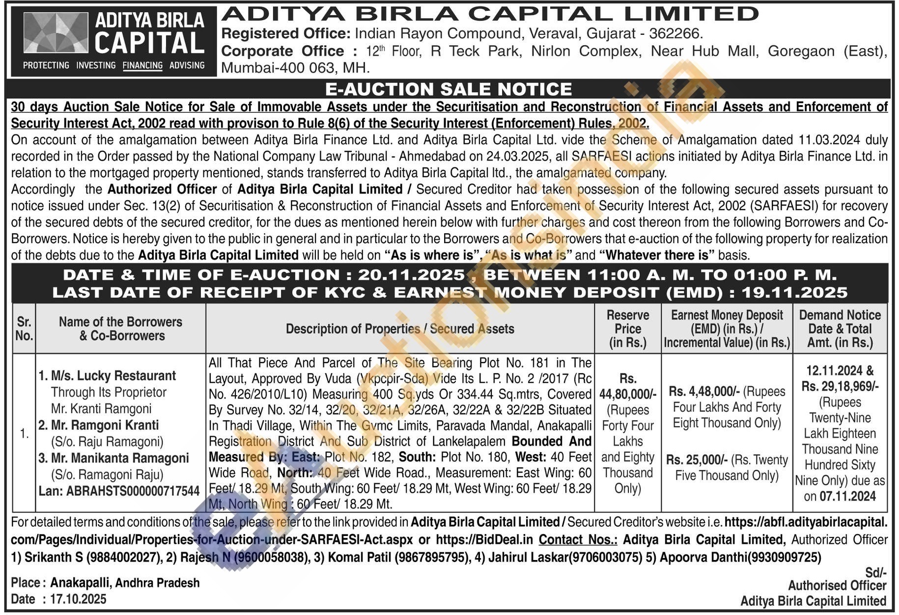 All That Piece And Parcel of The Site Bearing Plot No. 181 in The Layout, Approved By Vuda (Vkpcpir-Sda) Vide Its L. P. No. 2/2017 (Rc) Rs. No. 426/2010/L10) Measuring 400 Sq.yds Or 334.44 Sq.mtrs, Covered 44,80,000/-By Survey No. 32/14, 32/20, 32/21A, 32/26A, 32/22A & 32/22B Situated (Rupees In Thadi Village, Within The Gvmc Limits, Paravada Mandal, Anakapalli Registration District And Sub District of Lankelapalem Bounded And Measured By: East: Plot No. 182, South: Plot No. 180, West: 40 Feet Wide Road, North: 40 Feet Wide Road., Measurement: East Wing: 60 Feet/ 18.29 Mt, South Wing: 60 Feet/ 18.29 Mt, West Wing: 60 Feet/ 18.29 Mt, North Wing: 60 Feet/ 18.29 Mt.