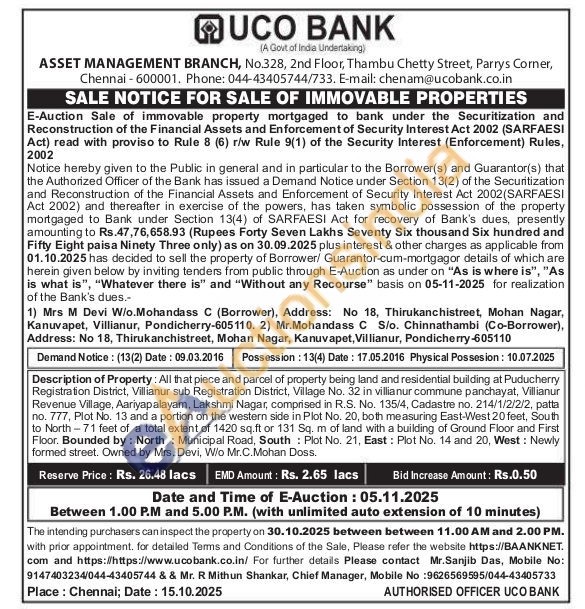 All that piece and parcel of property being land and residential building at Puducherry Registration District, Villianur sub Registration District, Village No. 32 in villianur commune panchayat, Villianur Revenue Village, Aariyapalayam, Lakshmi Nagar, comprised in R.S. No. 135/4, Cadastre no. 214/1/2/2/2, patta no. 777, Plot No. 13 and a portion on the western side in Plot No. 20, both measuring East-West 20 feet, South to North-71 feet of a total extent of 1420 sq.ft or 131 Sq. m of land with a building of Ground Floor and First Floor. Bounded by: North: Municipal Road, South Plot No. 21, East: Plot No. 14 and 20, West: Newly formed street. Owned by Mrs. Devi, W/o Mr.C.Mohan Doss.