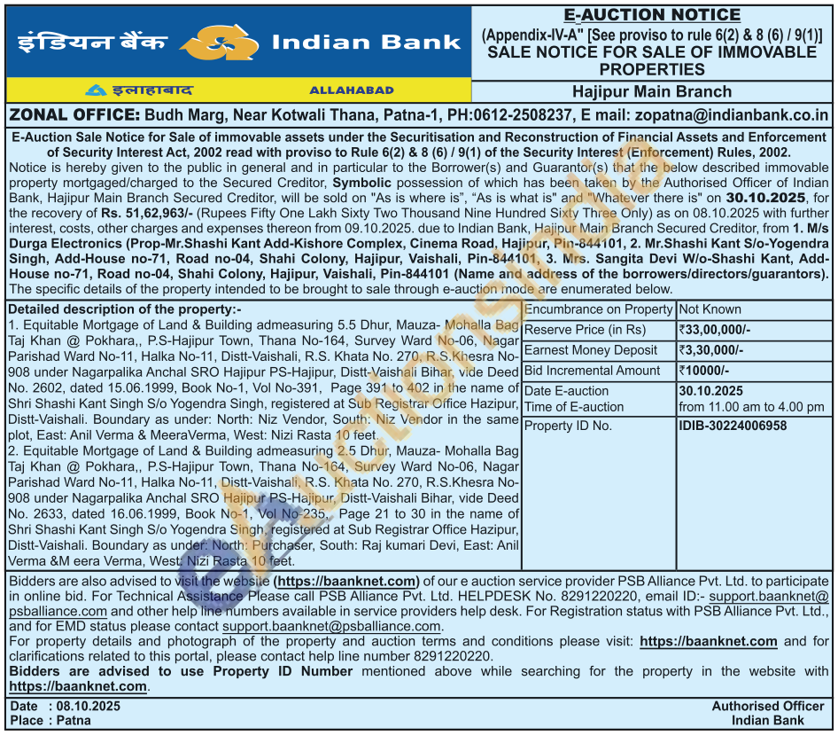 1. Equitable Mortgage of Land & Building admeasuring 5.5 Dhur, Mauza- Mohalla Bag Taj Khan @ Pokhara,, P.S-Hajipur Town, Thana No-164, Survey Ward No-06, Nagar Parishad Ward No-11, Halka No-11, Distt-Vaishali, R.S. Khata No. 270, R.S.Khesra No-908 under Nagarpalika Anchal SRO Hajipur PS-Hajipur, Distt-Vaishali Bihar, vide Deed No. 2602, dated 15.06.1999, Book No-1, Vol No-391, Page 391 to 402 in the name of Shri Shashi Kant Singh S/o Yogendra Singh, registered at Sub Registrar Office Hazipur, Distt-Vaishali. Boundary as under: North: Niz Vendor, South: Niz Vendor in the same plot, East: Anil Verma & MeeraVerma, West: Nizi Rasta 10 feet.2. Equitable Mortgage of Land & Building admeasuring 2.5 Dhur, Mauza- Mohalla Bag Taj Khan @ Pokhara,, P.S-Hajipur Town, Thana No-164, Survey Ward No-06, Nagar Parishad Ward No-11, Halka No-11, Distt-Vaishali, R.S. Khata No. 270, R.S.Khesra No-908 under Nagarpalika Anchal SRO Hajipur PS-Hajipur, Distt-Vaishali Bihar, vide Deed No. 2633, dated 16.06.1999, Book No-1, Vol No-235, Page 21 to 30 in the name of Shri Shashi Kant Singh S/o Yogendra Singh, registered at Sub Registrar Office Hazipur, Distt-Vaishali, Boundary as under: North: Purchaser, South: Raj kumari Devi, East: Anil Verma &M eera Verma, West: Nizi Rasta 10 feet.