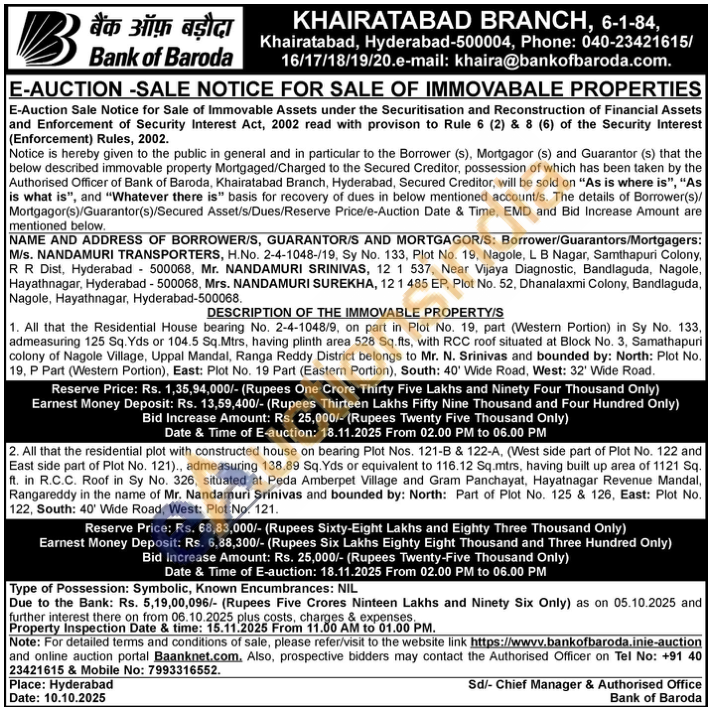 2. All that the residential plot with constructed house on bearing Plot Nos. 121-B & 122-A, (West side part of Plot No. 122 and East side part of Plot No. 121)., admeasuring 138.89 Sq. Yds or equivalent to 116.12 Sq.mtrs, having built up area of 1121 Sq. ft. in R.C.C. Roof in Sy No. 326, situated at Peda Amberpet Village and Gram Panchayat, Hayatnagar Revenue Mandal, Rangareddy in the name of Mr. Nandamuri Srinivas and bounded by: North: Part of Plot No. 125 & 126, East: Plot No. 122, South: 40' Wide Road, West: Plot No. 121.