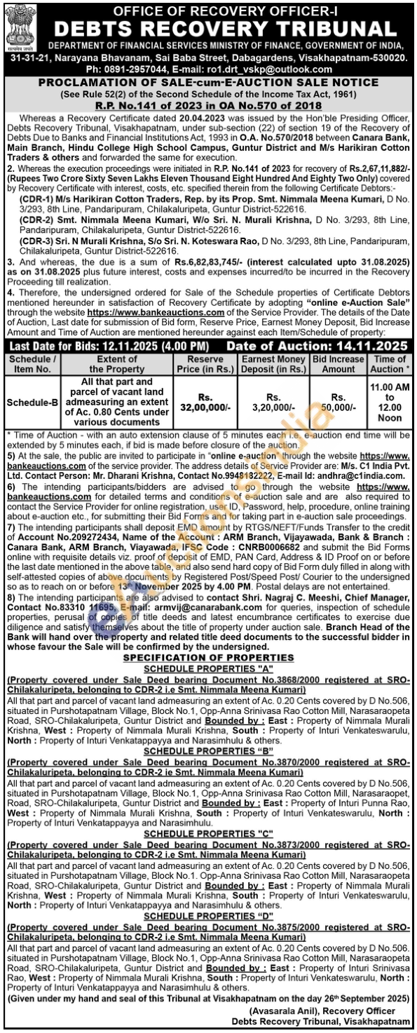 Property covered under Sale Deed bearing Document No.3868/2000 registered at SRO-Chilakaluripeta, belonging to CDR-2 ie Smt. Nimmala Meena Kumari) All that part and parcel of vacant land admeasuring an extent of Ac. 0.20 Cents covered by D No 506, situated in Purshotapatnam Village, Block No.1, Opp-Anna Srinivasa Rao Cotton Mill, Narasaraopeta Road, SRO-Chilakaluripeta, Guntur District and Bounded by: East: Property of Nimmala Murali Krishna, West: Property of Nimmala Murali Krishna, South Property of Inturi Venkateswarulu, North: Property of Inturi Venkatappayya and Narasimhulu & others SCHEDULE PROPERTIES "B" (Property covered under Sale Deed bearing Document No.3870/2000 registered at SRO-Chilakaluripeta, belonging to CDR-2 ie Smt. Nimmala Meena Kumari) All that part and parcel of vacant land admeasuring an extent of Ac. 0.20 Cents covered by D No.506, situated in Purshotapatnam Village, Block No.1, Opp-Anna Srinivasa Rao Cotton Mill, Narasaraopet, Road, SRO-Chilakaluripeta, Guntur District and Bounded by: East: Property of Inturi Punna Rao, West: Property of Nimmala Murali Krishna, South Property of Inturi Venkateswarulu, North: Property of Inturi Venkatappayya and Narasimhulu. SCHEDULE PROPERTIES "C" (Property covered under Sale Deed bearing. Document No.3873/2000 registered at SRO- Chilakaluripeta, belonging to CDR-2 le Smt. Nimmala Meena Kumari) All that part and parcel of vacant land admeasuring an extent of Ac. 0.20 Cents covered by D No.506, situated in Purshotapatnam Village, Block No. 1. Opp-Anna Srinivasa Rao Cotton Mill, Narasaraopeta Road, SRO-Chilakaluripeta, Guntur District and Bounded by: East: Property of Nimmala Murali Krishna, West: Property of Nimmala Murali Krishna, South Property of Inturi Venkateswarulu, North: Property of Inturi Venkatappayya and Narasimhulu & sulu & others SCHEDULE PROPERTIES "D" (Property covered under Sale Deed bearing Document No.3875/2000 registered at SRO-Chilakaluripeta, belonging to CDR-2 le Smt. Nimmala Meena Kumari) All that part and parcel of vacant land admeasuring an extent of Ac. 0.20 Cents covered by D No. 506. situated in Purshotapatnam Village, Block No. 1, Opp-Anna Srinivasa Rao Cotton Mill, Narasaraopeta Road, SRO-Chilakaluripeta, Guntur District and Bounded by: East: Property of Inturi Srovasa Krishna, South: Property of Inturi Venkateswarulu, North: Property of Inturi Venkatappayya and Narasimhulu & others.