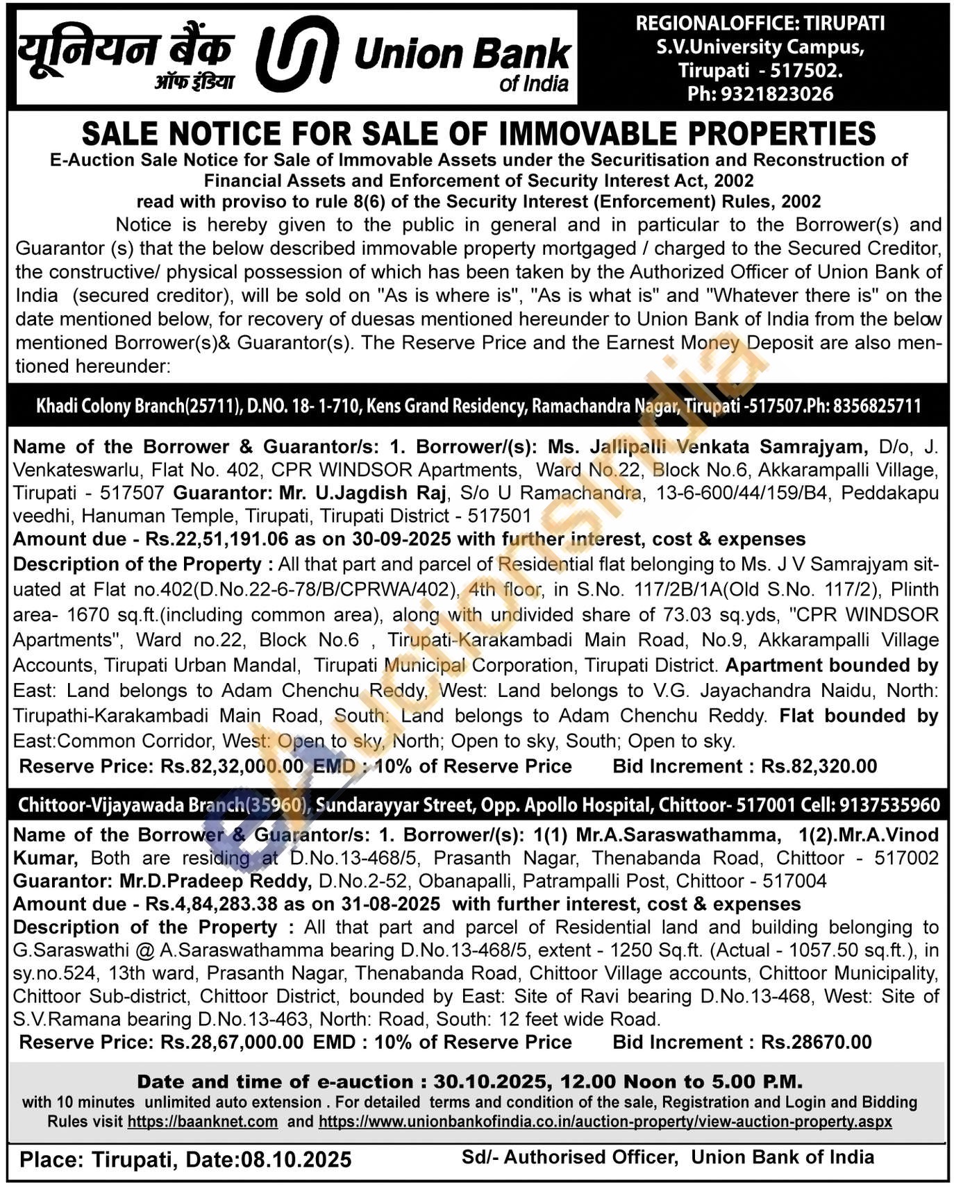 Description of the Property: All that part and parcel of Residential flat belonging to Ms. J V Samrajyam sit-uated at Flat no.402 (D.No.22-6-78/B/CPRWA/402), 4th floor, in S.No. 117/2B/1A(Old S.No. 117/2), Plinth area- 1670 sq.ft. (including common area), along with undivided share of 73.03 sq.yds, "CPR WINDSOR Apartments", Ward no.22, Block No.6, Tirupati-Karakambadi Main Road, No.9, Akkarampalli Village Accounts, Tirupati Urban Mandal, Tirupati Municipal Corporation, Tirupati District. Apartment bounded by East: Land belongs to Adam Chenchu Reddy, West: Land belongs to V.G. Jayachandra Naidu, North: Tirupathi-Karakambadi Main Road, South: Land belongs to Adam Chenchu Reddy. Flat bounded by East:Common Corridor, West: Open to sky, North; Open to sky, South; Open to sky.
