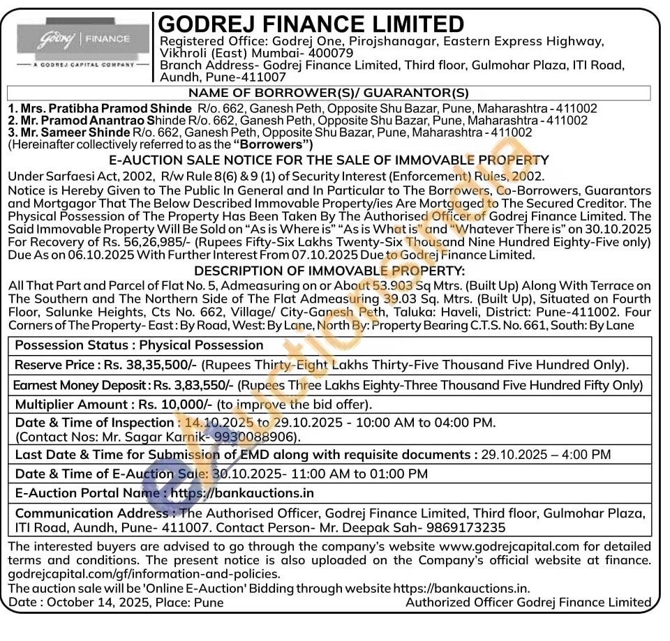 All That Part and Parcel of Flat No. 5, Admeasuring on or About 53.903 Sq Mtrs. (Built Up) Along With Terrace on The Southern and The Northern Side of The Flat Admeasuring 39.03 Sq. Mtrs. (Built Up), Situated on Fourth Floor, Salunke Heights, Cts No. 662, Village/ City-Ganesh Peth, Taluka: Haveli, District: Pune-411002. Four Corners of The Property- East: By Road, West: By Lane, North By: Property Bearing C.T.S. No. 661, South: By Lane