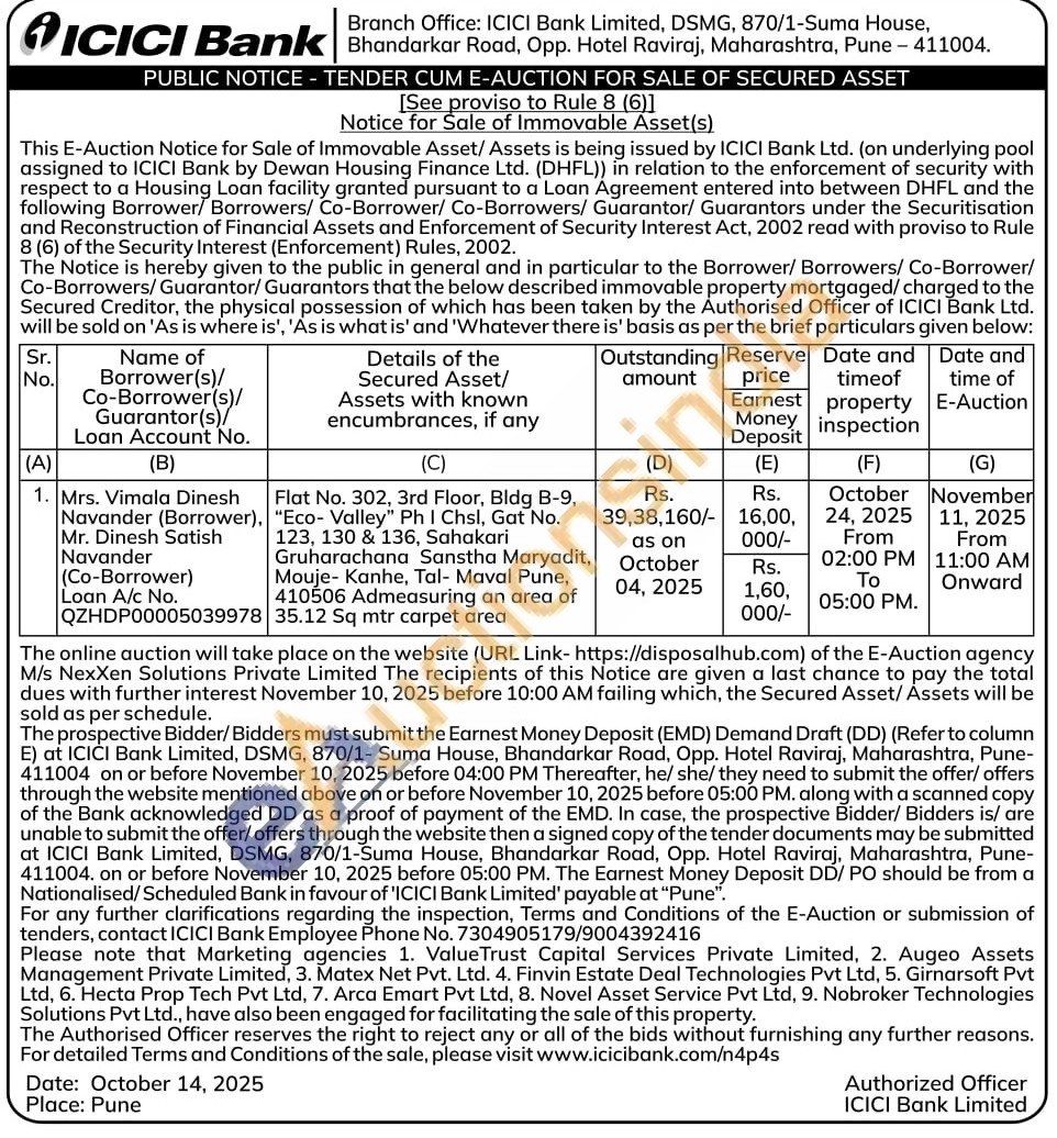 Flat No. 302, 3rd Floor, Bldg B-9, "Eco- Valley" Ph I Chsl, Gat No. 123, 130 & 136, Sahakari Gruharachana Sanstha Maryadit, Mouje- Kanhe, Tal- Maval Pune, 410506 Admeasuring an area of 35.12 Sq mtr carpet area