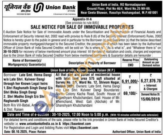All that part and parcel of residential house with total land area 575 sqft situated at Raisen (MP). Owners: Late Smt. Hema Dangi w/o Late Shri. Kulveer Dangi Boundaries: Survey No. 2/1, Ward No. 12, Shivom Nagar, North: Colony Kacha Road, South: House of Ghanshyam Khubchandani, East: House of Mr. Khemchand, West: Gali (Abchak) of Mr. Ghanshyam Khubchandani
