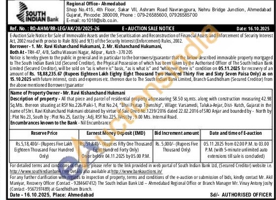 Description of property - All that piece and parcel of residential property admeasuring 58.50 sq.mts. along with construction measuring 42.98 Sq.Mts. thereon situating at RSY No.226/Paiki-1, Plot No.24, "Bhai Pratap Township", Village: Varsamedi, Taluka-Anjar, Dist- Kutch, Gujarat in the name of Shri. Ravi Kishanchand Hukmani obtained by virtue of Sale Deed No. 1239/2016 dated 22.02.2016 of SRO Anjar and bounded by North by Plot No.23, South by: Plot No. 25, East by: Adj. RSY No. 225, West by: 9.00 Mts. Internal Road.