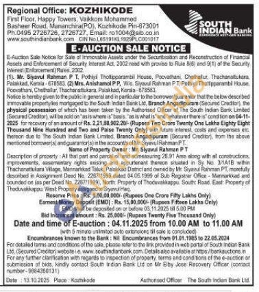 All that part and parcel of land acmeasuring 26.91 Ares along with al constructions improvements sasormentary rights eesting and appuntenant thereon situated in Sy No. 3/1A1B wth Thachanattukara Village, Mannarkikad Taluk, Palakkad District and owned by Mr. Siyavul Rahman PT, morefully described in Assignment Deed No. 2267/1999 dated 04.06.1999 of Sub Registrar Office-Mannarkkad and tounded on las per Deed No. 2267/1999), North Property of Thoduvakkappe South: Road East Property of Thoduvakkapou West: Property assigned to Siyavul Haq