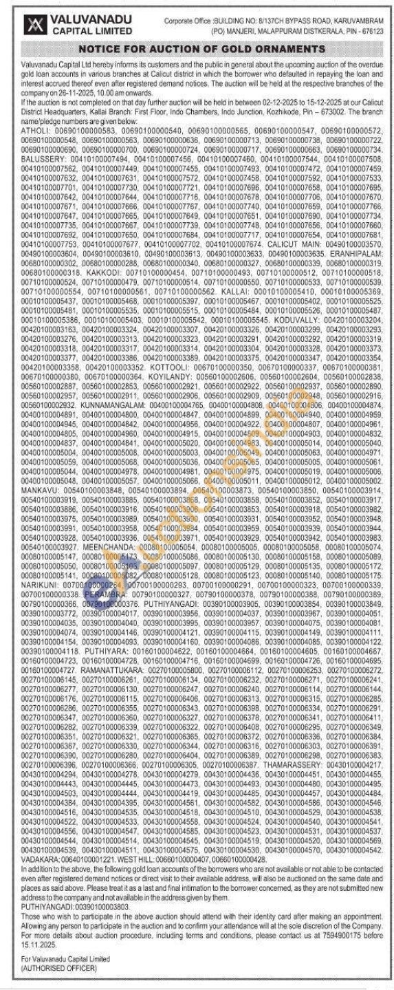 Valuvanadu Capital Limited Gold Auctions Auction in Kozhikode