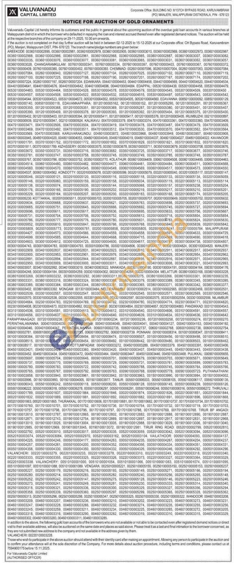 Valuvanadu Capital Limited Gold Auctions Auction in Malappuram