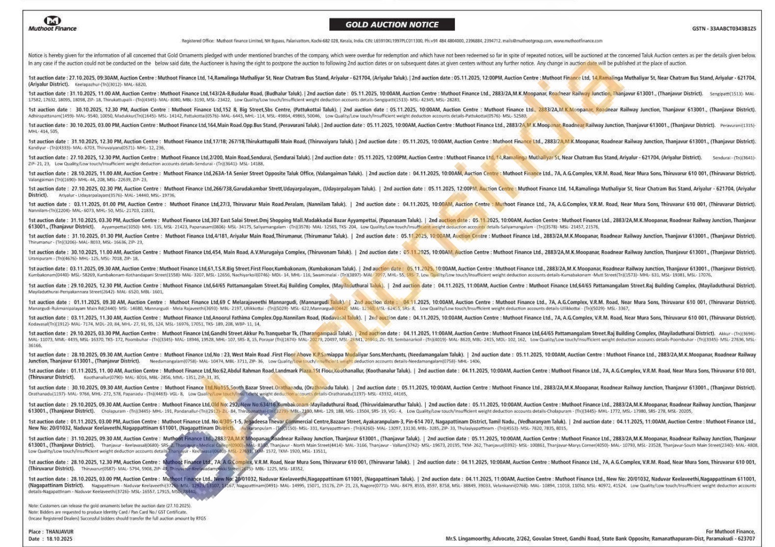 Muthoot Finance Ltd Gold Auctions Auction in Ariyalur
