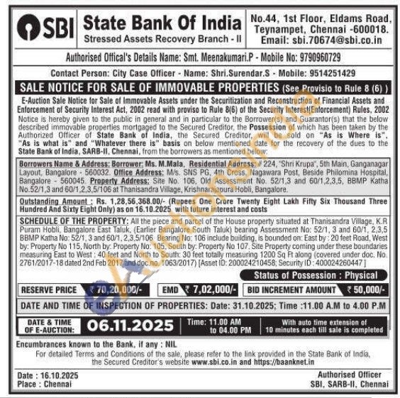 All the piece and parcel of the House property situated at Thanisandra Village, K.R Puram Hobli, Bangalore East Taluk, (Earlier Bangalore South Taluk) bearing Assessment No: 52/1, 3 and 60/1, 2,3,5 BBMP Katha No: 52/1, 3 and 60/1, 2,3,5/106 Bearing No: 106 include building, is bounded on: East by: 20 feet Road, West by: Property No 115, North by. Property No: 105, South by. Property No 107. Site Property corning under these boundaries measuring East to West: 40 feet and North to South: 30 feet totally measuring 1200 Sq Ft along (covered under doc. No. 2761/2017-18 dated 2nd Feb 2017 and doc.no. 1063/2017) [Asset ID: 200024210458; Security ID: 400024260447]