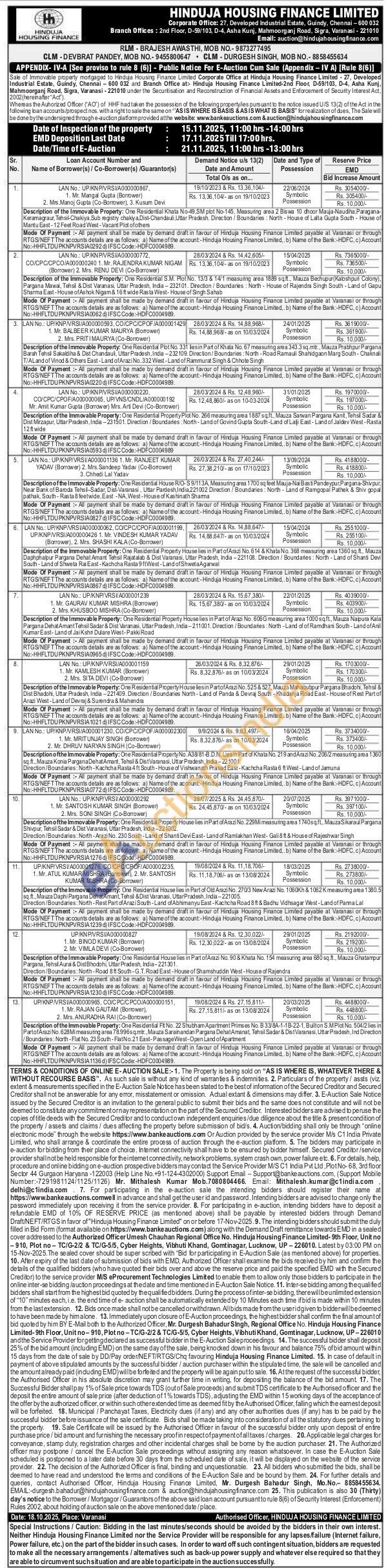 Description ofthe Immovable Property: One Residential Property House lies in Part of Arazi No. 229 Mi measuring area 1740sq.ft., Mauza Sikaraul Pargana Shivpur, Tehsil Sadar & Dist Varanasi, Uttar Pradesh, India-221002. Direction/Boundaries: North-Arazi No. 230 South-Land of Shanti Devi East-Land of Ramlakhan West-Gali 8 ft & House of Rajeshwar Singh