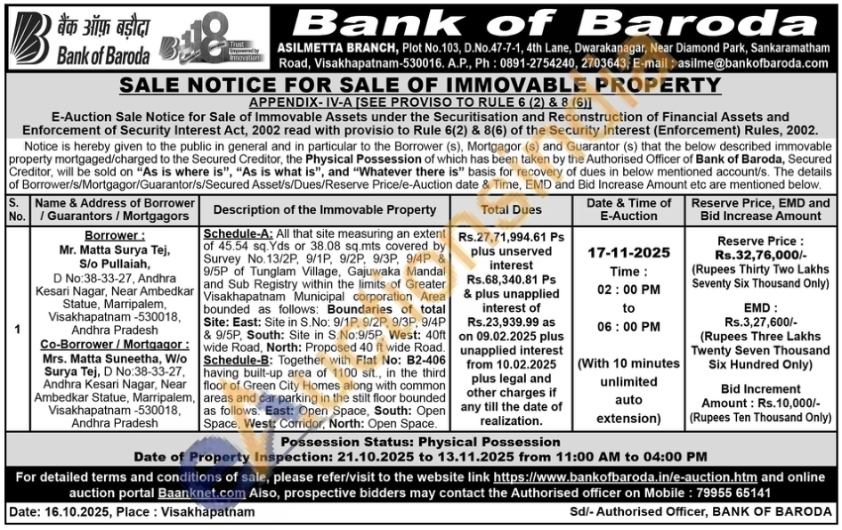Schedule-A: All that site measuring an extent of 45.54 sq. Yds or 38.08 sq.mts covered by Survey No. 13/2P, 9/1P, 9/2P, 9/3P, 9/4P & 9/5P of Tunglam Village, Gajuwaka Mandal and Sub Registry within the limits of Greater Visakhapatnam Municipal corporation Area bounded as follows: Boundaries of total Site: East: Site in S.No: 9/1P, 9/2P, 9/3P, 9/4P & 9/5P, South: Site in S.No:9/5P, West: 40ft wide Road, North: Proposed 40 ft wide Road. Schedule-B: Together with Flat No: B2-406 having built-up area of 1100 sft., in the third floor of Green City Homes along with common areas and car parking in the stilt floor bounded as follows. East: Open Space, South: Open Space, West: Corridor, North: Open Space