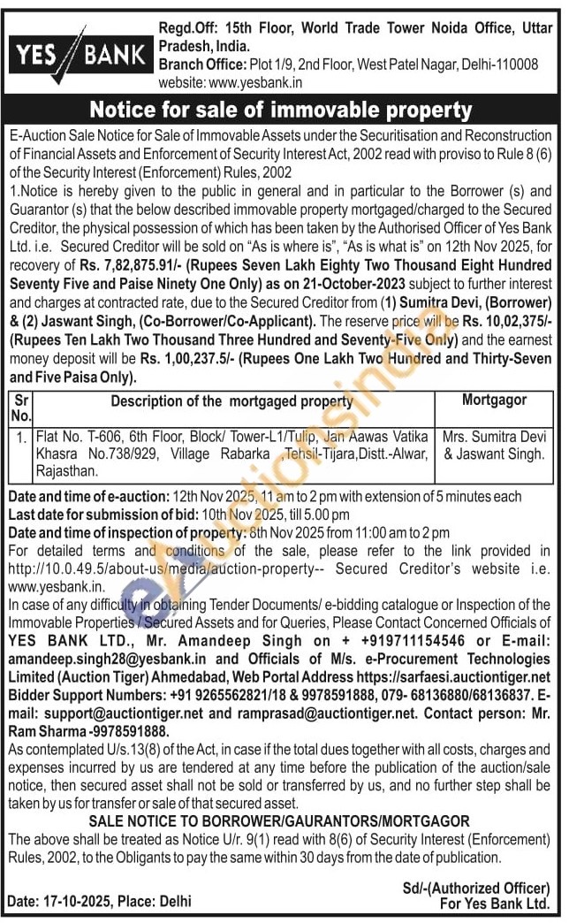 Flat No. T-606, 6th Floor, Block/ Tower-L1/Tulip, Jan Aawas Vatika Khasra No.738/929, Village Rabarka, Tehsil-Tijara, Distt.-Alwar, Rajasthan