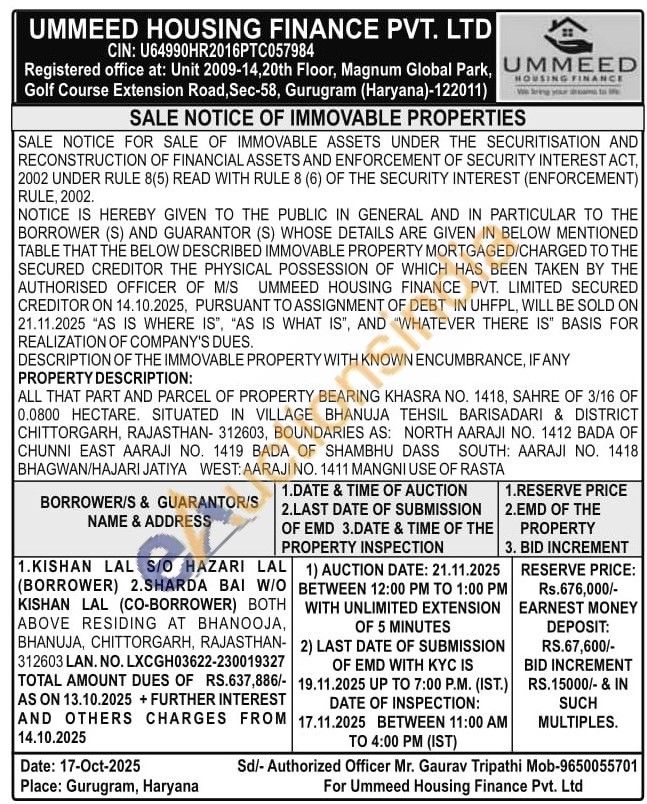 PROPERTY DESCRIPTION: ALL THAT PART AND PARCEL OF PROPERTY BEARING KHASRA NO. 1418, SAHRE OF 3/16 OF 0.0800 НЕСTARE. SITUATED IN VILLAGE BHANUJA TEHSIL BARISADARI & DISTRICT CHITTORGARH, RAJASTHAN- 312603, BOUNDARIES AS: NORTH AARAJI NO. 1412 BADA OF CHUNNI EAST AARAJI NO. 1419 BADA OF SHAMBHU DASS SOUTH: AARAJI NO. 1418 BHAGWAN/HAJARI JATIYA WEST: AARAJI NO. 1411 MANGNI USE OF RASTA