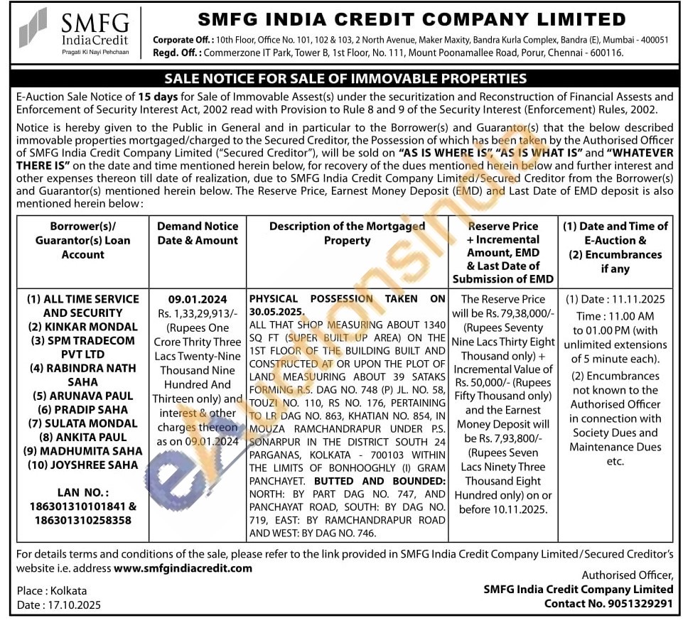 PHYSICAL POSSESSION TAKEN ON 30.05.2025 : ALL THAT SHOP MEASURING ABOUT 1340 SQ FT (SUPER BUILT UP AREA) ON THE 1ST FLOOR OF THE BUILDING BUILT AND CONSTRUCTED AT OR UPON THE PLOT OF LAND MEASUURING ABOUT 39 SATAKS FORMING R.S. DAG NO. 748 (P) JL. NO. 58, TOUZI NO. 110, RS NO. 176, PERTAINING TO LR DAG NO. 863, KHATIAN NO. 854, IN MOUZA RAMCHANDRAPUR UNDER P.S. SONARPUR IN THE DISTRICT SOUTH 24 PARGANAS, KOLKATA 700103 WITHIN THE LIMITS OF BONHOOGHLY (1) GRAM PANCHAYET. BUTTED AND BOUNDED: NORTH: BY PART DAG NO. 747, AND PANCHAYAT ROAD, SOUTH: BY DAG NO. 719, EAST: BY RAMCHANDRAPUR ROAD AND WEST: BY DAG NO. 746