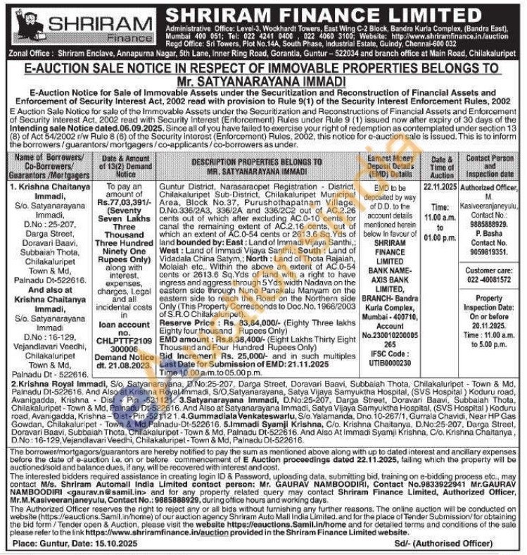 Guntur District, Narasaraopet Registration District, Chilakaluripet Sub-District, Chilakaluripet Municipal Area, Block No.37, Purushothapatnam Village, D.No.336/243, 336/2A and 336/2C2 out of AC.2.26 cents out of which after excluding AC.0-10 cents for canal the remaining extent of AC.2.16 cents, out of which an extent of AC.0-54 cents or 2613.6 Sq. Yds of land bounded by: East: Land of Immadi Vijaya Santhi, West: Land of Immadi Vijaya Santhi, South: Land of Vidadala China Satym,; North: Land of Thota Rajalah, Molaiah etc,.. Within the above an extent of AC.0-54 cents or 2613.6 Sq. Yds of land with a right to have ingress and aggress through 5 Yds width Nadava on the eastern side through Nune Panakalu Manyam on the eastern side to reach the Road on the Northern side Only (This Property Corresponds to Doc. No. 1966/2003 of S.R.O Chilakaluripet)