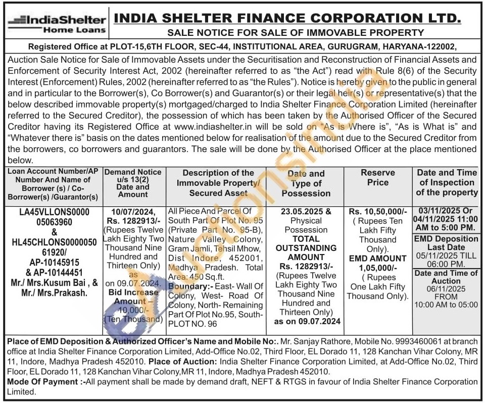 All Piece And Parcel Of South Part Of Plot No. 95 (Private Part No. 95-B), Nature Valley Colony, Gram Jamli, Tehsil Mhow, Dist Indore, 452001, Madhya Pradesh. Total Area: 450 Sq.ft. Boundary:- East-Wall Of Colony, West- Road Of Colony, North-Remaining Part Of Plot No.95, South-PLOT NO. 96
