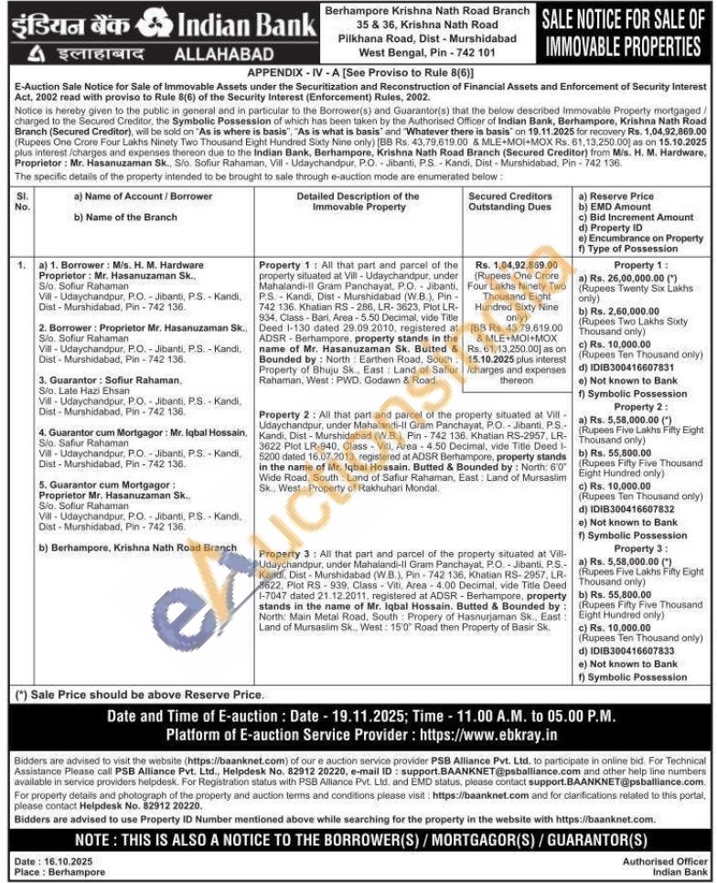 Property 3: All that part and parcel of the property situated at Vill-Udaychandpur, under Mahalandi-II Gram Panchayat, P.O-Jibanti, P.S. Kandi, Dist-Murshidabad (W.B.), Pin-742 136, Khatian RS-2957, LR. 3622, Plot RS-939, Class Viti, Area-4.00 Decimal, vide Title Deed 1-7047 dated 21.12.2011, registered at ADSR - Berhampore, property stands in the name of Mr. Iqbal Hossain. Butted & Bounded by: North: Main Metal Road, South Propery of Hasnurjaman Sk., East Land of Mursaslim Sk., West: 150 Road then Property of Basir Sk.