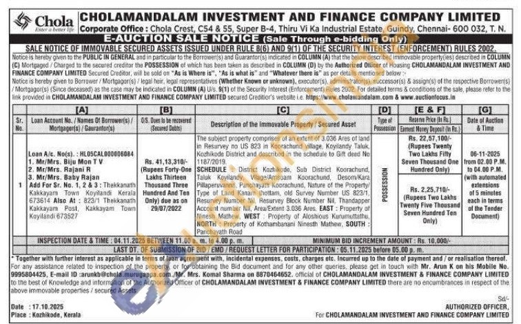 The subject property comprises of an extent of 3.036 Ares of land in Resurvey no US 823 in Koorachund village, Koylandy Taluk Kozhikode District and described in the schedule to Gift dead No 1187/2019SCHEDULE District Kozhikode, Sub District Koorachund Taluk Koyilandy, Vilage Amscam Koorachund, Desom/Kara Pillaperuvanna, Panchayath Koorachund, Nature of the Property Type of Land Kanam thottam, old Survey Number US 823/1. Resurvey Number Nil, Resurvey Block Number Nil, Thandapper Account number Nil, Area/Extent 3.036 Ares, EAST: Property of Ninesh Mathew, WEST Property of Aloshious Kurumuttatho NORTH: Property of Kothambanani Ninesth Mathew, SOUTH: Panchayath Road