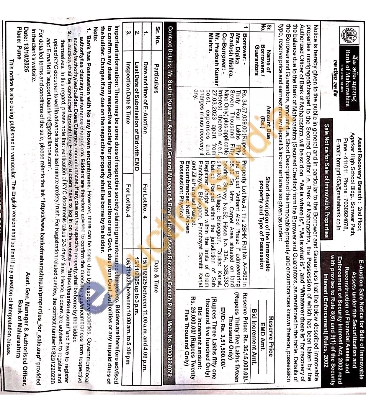 Property Lot No.4: The 2BHK Flat No. A4-506 in the project "Arihant Aloki Phase I" admeasuring 55.82 Sq. Mtrs. Carpet Area situated on land bearing Survey No.52, Hissa No. 33A, 33B,33C situated at Village: Bhisegaon, Taluka: Karjat, District: Raigad within the jurisdiction of Sub Registrar: Karjat and within the limits of Gram Panchayat: Bhisegaon, Panchayat Samiti: Karjat and Zilla Parishad: Raigad. Encumbrances: Not Known