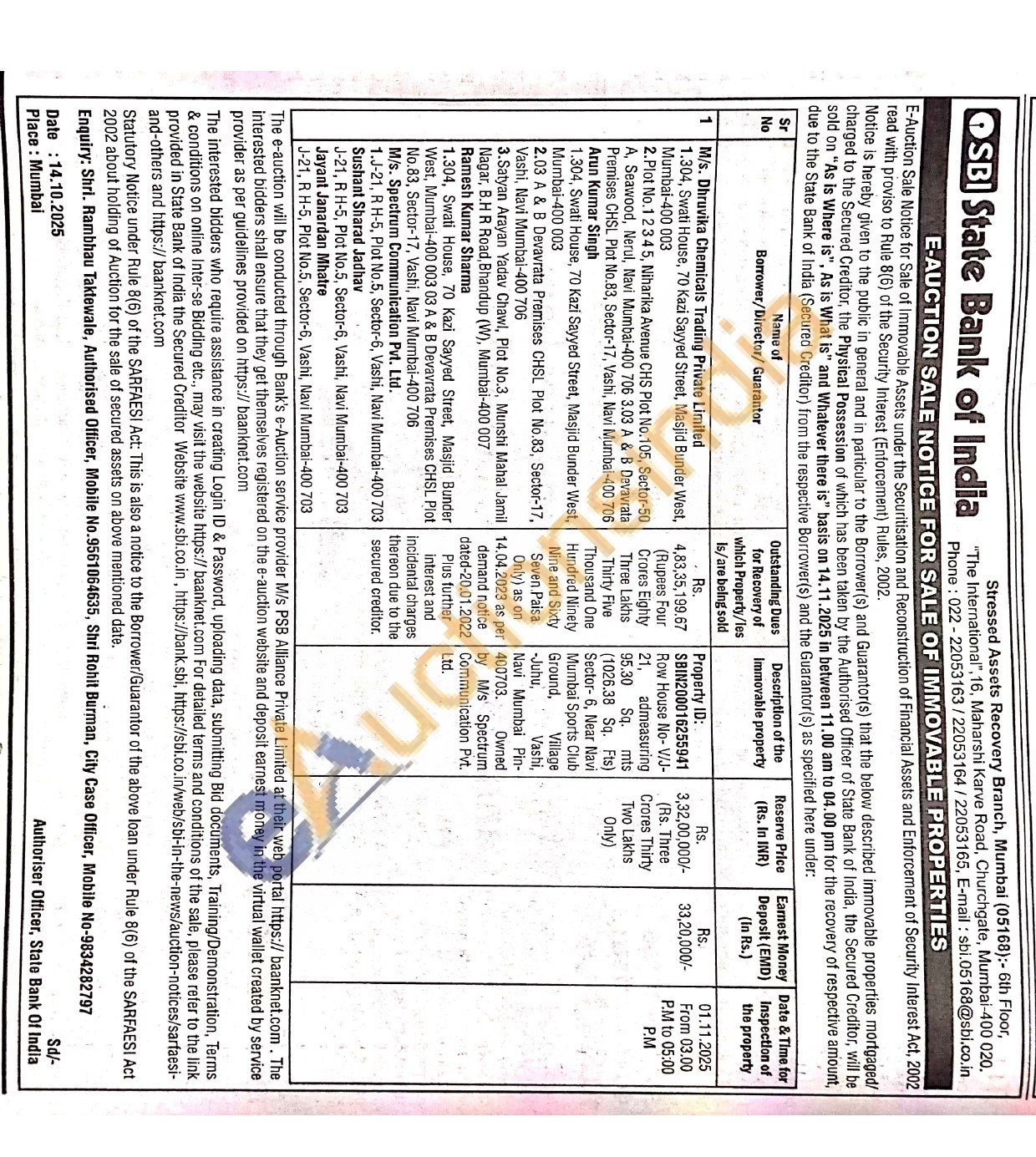 SBIN200016255941 Row House No- V/J-21, admeasuring 95.30 Sq. mts (1026.38 Sq. Fts) Sector-6, Near Navi Mumbai Sports Club Ground, Village -Juhu, Vashi, Navi Mumbai Pin-400703. by M/s Spectrum Communication Pvt. Ltd.
