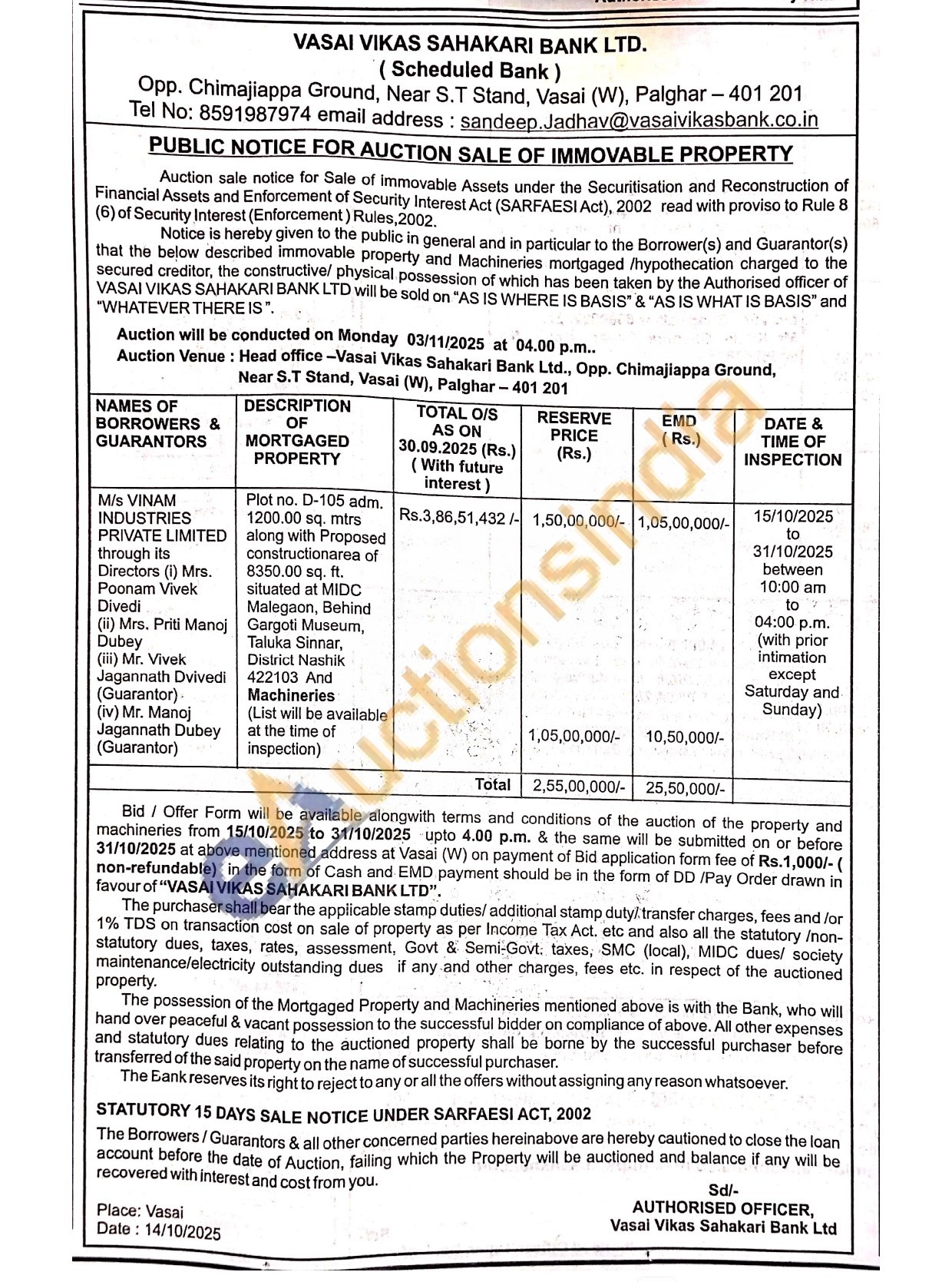 Plot no. D-105 adm. 1200.00 sq. mtrs along with Proposed constructionarea of 8350.00 sq. ft. situated at MIDC Malegaon, Behind Gargoti Museum, Taluka Sinnar, District Nashik 422103 And Machineries (List will be available at the time of inspection)