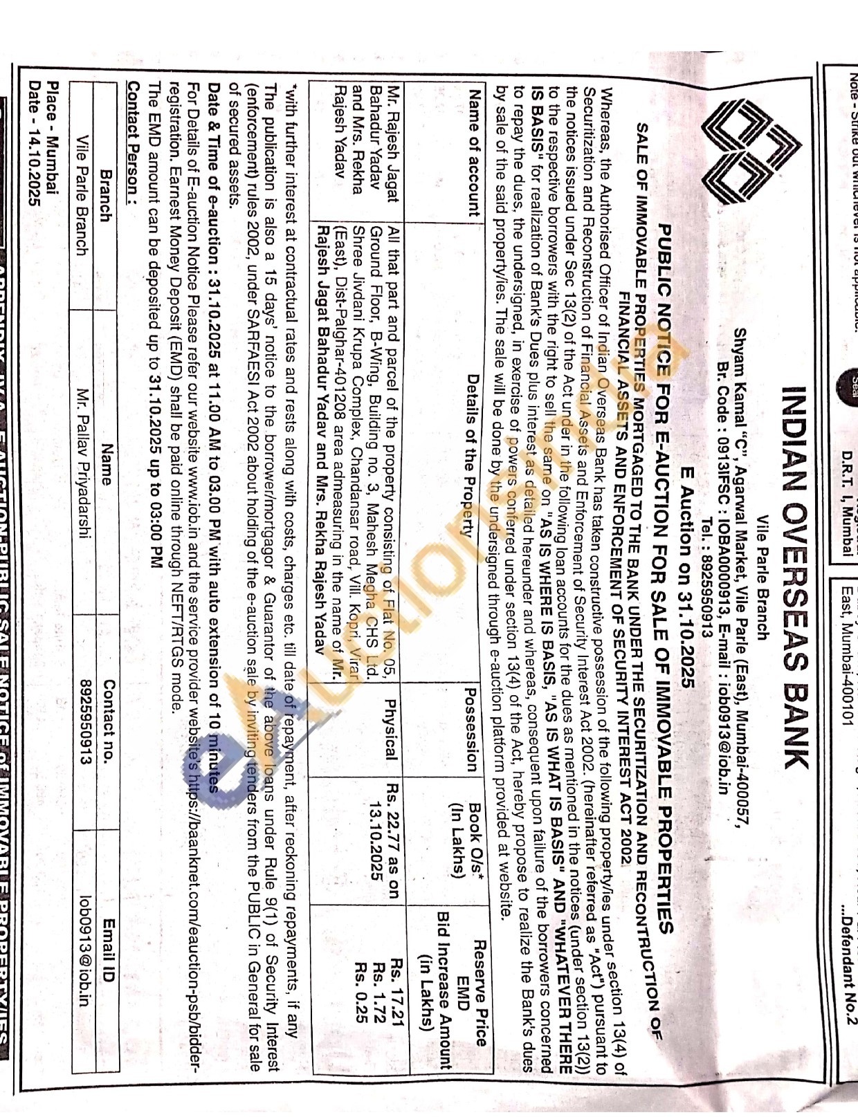 All that part and parcel of the property consisting of Flat No. 05 Ground Floor, B-Wing, Building no. 3, Mahesh Megha CHS Ltd. Shree Jivdani Krupa Complex, Chandansar road, Vill. Kopri, Virar (East), Dist-Palghar-401208 area admeasuring in the name of Mr. Rajesh Jagat Bahadur Yadav and Mrs. Rekha Rajesh Yadav