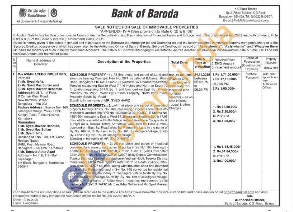 SCHEDULE PROPERTY 3: All that piece and parcel of Industrial converted land measuring 3 acres 26 guntas in Sy. No. 160, bearing E-Khatha No. 152500403301900198, VPK No. 188/160, (vide Order dated 22.04.2008 in No. ALN (TMK) CR.215/2007-08 by Deputy Commissioner, Tumkur District,) situated at Jaladigere, Yediyur Hobli, Tumkur District. measuring East to West: 57.912 mtrs, North to South 254.508 mtrs. total area: 14739.07 sq. mtrs. along with industrial shed and bounded on: East By: Remaining land in Sy. No. 160 converted for residential purpose, West By: Boundary of Thattagere Village, North By: Sy. No. 161 of Jaladigere Village, South By: Sy. No. 159 of Jaladigere Village Standing in the name of Asian Acero Industries represented by its partners MR. SYED HAFIZ, Mr. Syed Maz Sultan and Mr. Syed Maveez Rehman