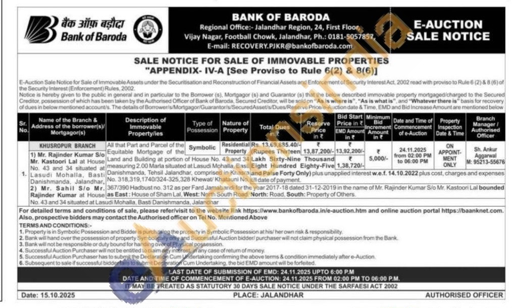 All that Part and Parcel of the Equitable Mortgage of the Land and Building at portion of House No. 43 and 34 measuring 2.00 Marla situated at Lasudi Mohalla, Basti Danishmanda, Tehsil Jalandhar, comprised in Khasra No. 318,319,1740/324-325,328 Khewat/ Khatauni No 367/390 Hadbust no. 312 as per Fard Jamabandi for the year 2017-18 dated 31-12-2019 in the name of Mr. Rajinder Kumar S/o Mr. Kastoori Lal bounded as East: House of Sham Lal. West: North South Road, North: Road, South: Property of Others