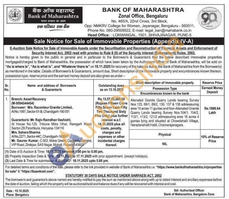 Alienated Granite Quarry Lands bearing Survey Nos. 125, 89/1, 89/2, 136, 137 & 138 admeasuring area 15 acres 11 guntas and Non-Alienated Granite Quarry Lands bearing Survey Nos. 104/1, 104/2, 113/1, 113/2, 121/2 admeasuring area 16 acres 4 guntas lying and situated at Chowdahalli Village, Haradanahalli Hobli, Chamarajanagara