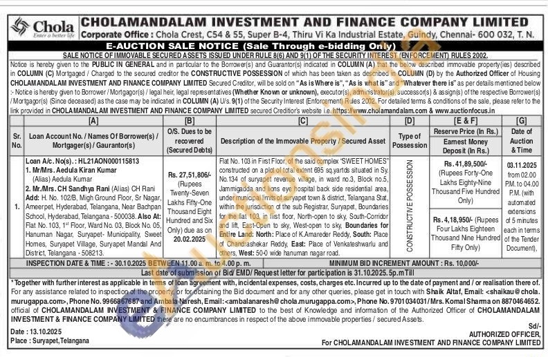 Flat No. 103 in First Floor, of the said complex "SWEET HOMES" constructed on a plot of total extent 695 sq.yartds situated in Sy No. 134 of suryapet revenue village, in ward no.3, Block no.5. Jammigadda and lions eye hospital back side residential area, limits of district, Stat, within the jurisdiction of the sub Registrar, Suryapet, Boundaries for the flat 103, in first floor, North-open to sky, South-Corridor and lift, East-Open to sky, West-open to sky, Boundaries for Entire Land: North: Place of K.Amareder Reddy, South: Place of Chandrashekar Reddy, East: Place of Venkateshwarlu and others, West: 50-0 wide hanuman nagar road.