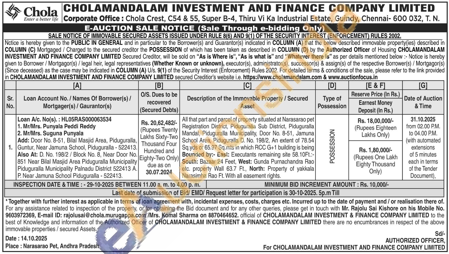 All that part and parcel of property situated at Narasarao pet Registration District, Piduguralla Sub District, Piduguralla Mandal, Piduguralla Municipality, Door No. 8-51, Jamuna School Area, Piduguralla D. No. 198/2, An extent of 78.54 Sq.yds or 65.97 Sq.mts in which RCC G+1 building is being Bounded by:- East: Executants remaining site 58.10Ft.:-South: Bazaar 24 Feet, West: Gunda Purnachandra Rao etc. property Wall 63.7 Ft., North: Property of yakkala Narasimha Rao Ft. With all easement rights
